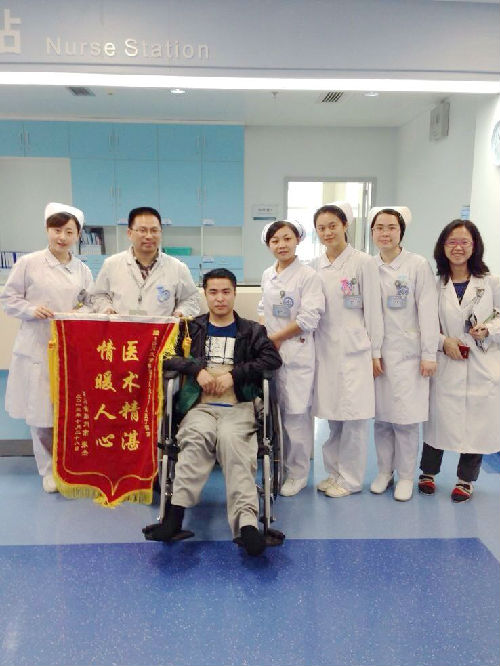 该伤员在“420芦山地震”中不幸腰椎骨折造成腰部脊髓损伤,由上锦分院骨科转入康复医学中心进行康复治疗。患者入院初期精神较差,情绪低落,入院后出现高烧不退,经过医生护士的积极处理,体温很快得到了控制。在接下来几个月时间里,医护人员制定了合理的治疗方案积极治疗,耐心地为他讲解相关健康知识,鼓励他树立战胜疾病的信心,病员的情绪逐渐得到了好转,更加积极主动地配合康复治疗。
