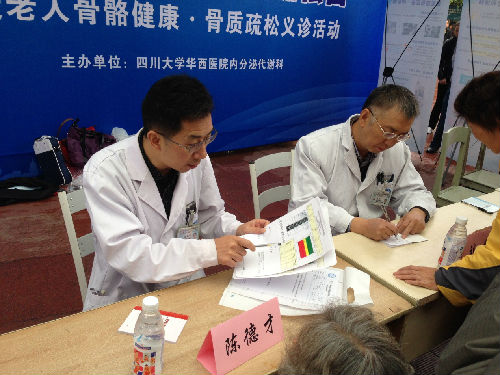 内分泌科陈德才教授、魏松全教授、风湿免疫科刘钢教授等10名多学科专业医务人员参加义诊,耐心解答了患者骨质疏松与骨质疏松性骨折等问题,为骨质疏松患者提供了个体化的用药方案建议,50名患者获得了义诊提供的免费骨密度检测服务。上午11:00-12:00时,内分泌代谢科医生王覃为广大患者及家属宣讲了骨质疏松预防及防治相关知识a,受到参会人员好评。