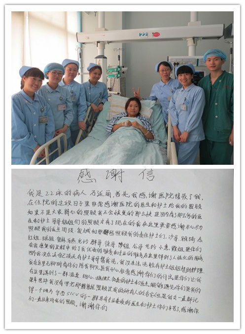 9月12日,病情稳定的石延丽写了感谢信,以表达自己的感激之情,信中她提到“在我康复的过程中给了我优质的服务和专业的服务,在这里我得到了人性化的服务”。