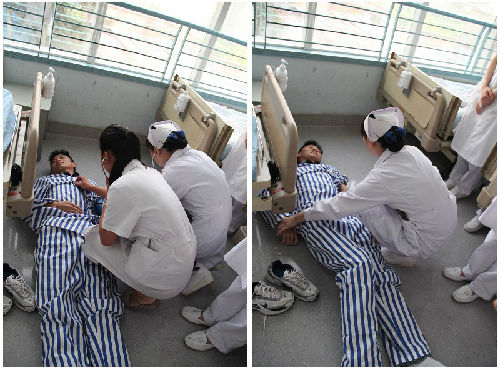 此次演练由护士分别扮演患者、家属、值班护士等角色,邀请医生扮演值班医生一角。设置场景为病房内,一名患者下床时不慎跌倒,护士马上对其进行生命体征、神志、伤情评估,立即通知医生并做相应的处理;同时告知家属,并协助医生进一步处理后汇报病房护士长。医护之间互相协作,积极配合,流程顺畅。