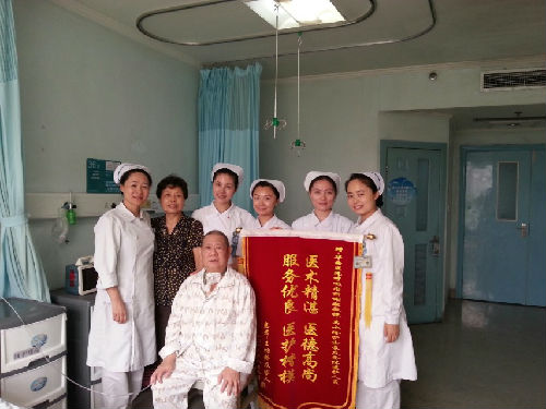 由于患者病情危重,同时伴有多器官功能衰竭,住院期间因病情反复,曾多次出现呼吸道梗阻等危急情况,每次都是在经过医护团队的全力抢救后才得以脱离危险。结合患者病情特点,呼吸内科医护团队进行了多次讨论,制定出了一套针对性强,有效的治疗护理方案。同时考虑到患者气管切开后易出现感染、气道分泌物干结等并发症,护理小组通过多次护理查房,集思广益、反复试验,设计出了用于气切患者金属导管连接人工鼻的装置,较好地避免了上述并发症的发生保障了患者的安全。通过呼吸内科医护团队的共同努力,患者于8月9日在病情稳定、情绪良好的情况下办理了出院。在即将出院之际,该患者及家属主动要求与救治和护理过他的医护人员合影,并献上锦旗,以感激这些给予他第二次生命的人 。