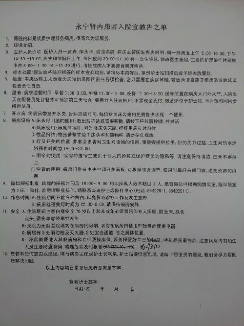 入院宣教是患者在住院期间与护理人员架起的第一座沟通桥梁,为了更规范入院宣教内容,避免护士在行入院宣教时口述介绍不够详细,永宁肾内科在口述介绍的同时使用了纸质版入院宣教。宣教内容包括:环境介绍、医护人员介绍、标本处置、检查、膳食、安全等项目。护士行入院宣教后请患者签字确认。采用纸质版入院宣教后更加规范统一了护士宣教内容,还可以促使患者减轻焦虑、消除陌生感、尽快熟悉和适应医院环境,并以稳定的情绪积极配合治疗,还可以迅速建立良好的护患关系。永宁肾内科优化优质护理服务,切实落实好入院宣教工作,获得了病员和家属一致好评。