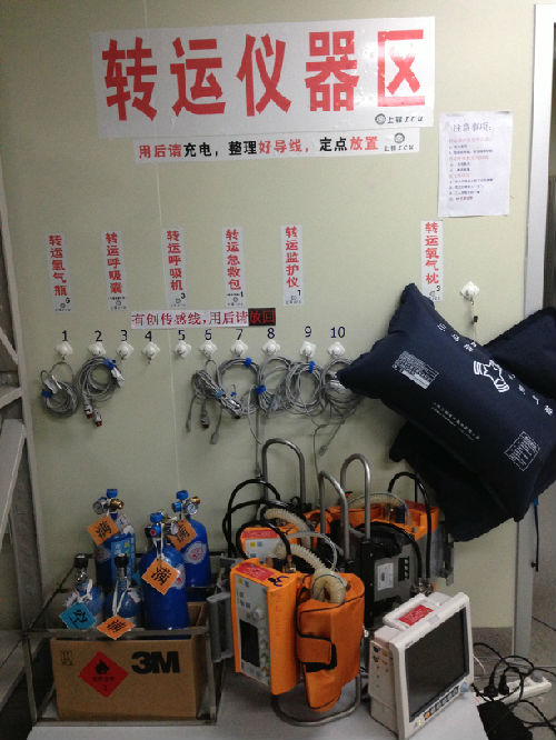 转运呼吸机、氧气瓶、转运监护仪、氧气枕、充电电源等定位、定点放置,定时充电备用,每样仪器做专用标示表明时间、状态,为医护人员的使用提供有效依据。执行转运仪器规范化管理以来,得到了本科室医生和护士的一致好评,方便了每一个使用人了解相关注意事项,为转运提供医疗护理安全保障。