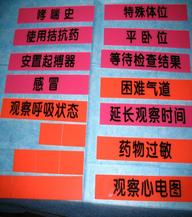 由于病人周转极快(平均监护时间30-120min),且每名患者的观察重点不同,给医疗护理工作带来了极大挑战。为了使患者更加安全、有效地度过麻醉恢复期,麻醉复苏室医护人员为患者制作了常见的特殊病情提示卡。这些卡片包含患者的特殊病史和常见并发症,如困难气道、传染病、喉痉挛、哮喘、心律失常、特殊体位、使用拮抗剂等,有效提高了护理工作效率和病人安全质量管理,受到医护人员及手术医生的好评。