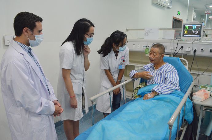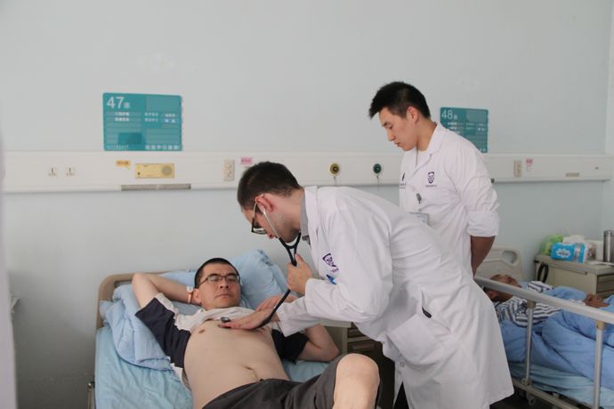心内科的学习由任务老师和魏医生带领中外学生一起查房,对典型病人进行了仔细的问诊并辅以相关查体。同学们针对病案积极讨论,大家在临床伦理和医学规范等方面产生了激烈的思想碰撞,并就专业知识和医学教育进程等问题进行了交流。