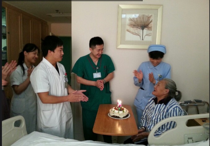 2013年6月19日,地震创伤重症病房一名伤员迎来了八十岁生日。周琰医疗组长、尹万红医师、住院总周然、护士长刘帆、值班护士唐敏、刘嘉斌、陈春蓉等代表全科人员为寿星送上了生日祝福和生日礼物。病房内响起了“祝你生日快乐”的歌声,伤员及家属非常感动,对华西医护人员无微不至的关心深表感谢。