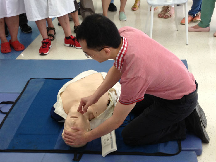 两位急诊科医师演示了心肺复苏基本生命支持术的操作全过程,通过对心肺复苏、除颤仪使用、呼吸机的使用、气管插管的学习,使大家进一步掌握了心肺复苏术的操作方法,熟悉和掌握了实践操作过程中的重要环节,学习人员积极有序地展开练习,同时互相交流,力争做到迅速、正确、规范、有效。
