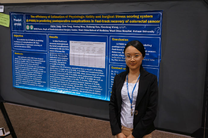 我院2010级临床医学八年制杨济桥参会并展示了胃肠外科手术中心MCQ团队的科研摘要“THE EFFICIENCY OF ESTIMATIONOF PHYSIOLOGIC ABILITY AND SURGICAL STRESS SCORING SYSTEM IN PREDICTINGPOSTOPERATIVE COMPLICATIONS IN FAST-TRACK RECOVERY OF COLORECTAL CANCER. J.Yang, C. Fang, J. Wen, X. Xue, X. Wang, L. Li”(指导教师:胃肠外科李立、汪晓东)。参会期间,学生与各国外科医师及医学生深入交流了临床科研设计思路和样本控制等,获得了结直肠领域行业专家的建议和鼓励。
