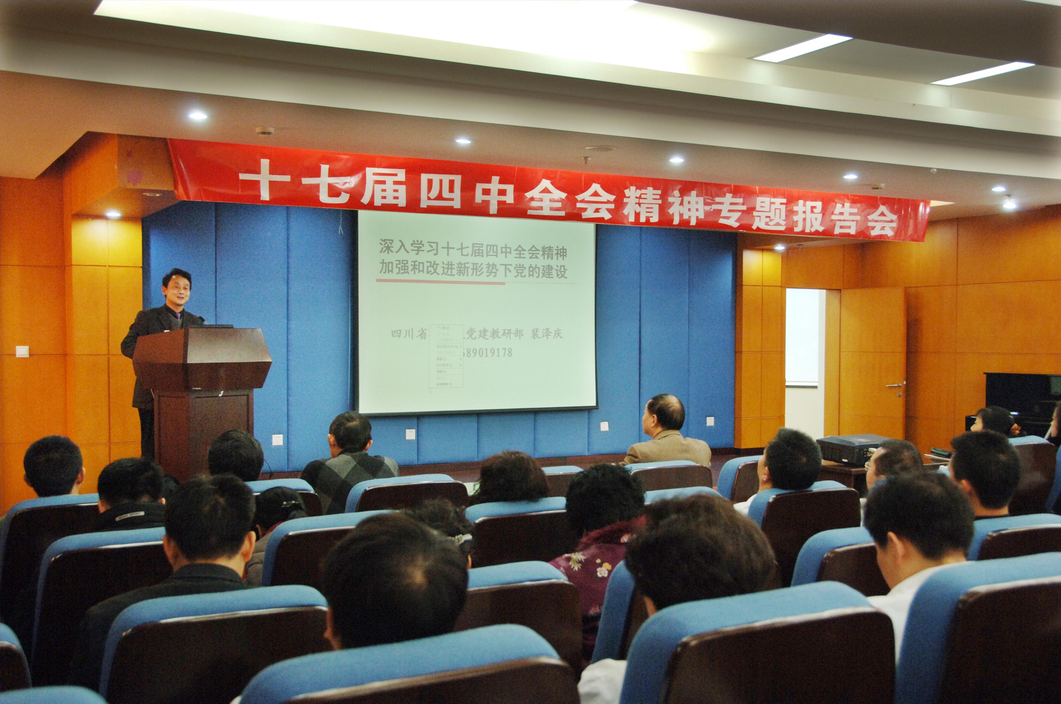 2009年12月17日下午2:30,我院中心组(扩大)学习十七届四中全会精神专题报告会在第二住院大楼三楼学术厅举行。报告会特别邀请了四川省委党校党建教研部裴泽庆教授就十七届四中全会精神作了精彩讲演,院领导、党委委员、纪委委员以及各临床、职能部门负责人近200人参加了会议。会议由院党委邓绍林副书记主持。