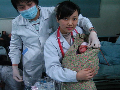 孩子母亲为37岁高龄经产妇,于11月25日入住中西医结合科监护室,入院诊断为晚期妊娠合并重症急性胰腺炎;肝内外胆管扩张伴结石;甲状腺功能亢进4.脾脏长大。入院时病情危重且特殊,系高危妊娠,腹痛腹胀明显,并伴有呼吸困难,呼吸急促,心率快。治疗期间,于2009年12月1日23:25突然出现腹痛明显,宫缩频繁,破膜,我院医生立即联系附二院产科住院总紧急会诊,但患者为经产妇,产程极为短暂,产科住院总来不及及时到位,中西医结合科住院总及全部值班医生护理人员立即组成紧急接产治疗小组,辅助该重症产妇分娩。23:50,患者顺利娩出一足月女婴,立即给予清理呼吸道,吸氧及加强保暖,随即联系附二院新生儿科及ICU住院总共同查看婴儿,产科Apgar评分为9-9-10-10。最后,新生儿被护送至附二院新生儿病房,产妇留我院继续治疗。