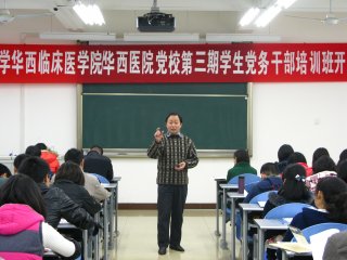 12月3日晚19:00,由华西临床医学院/华西医院党委组织部、学生党总支主办的“华西临床医学院/华西医院党校第三期学生党务干部培训班”开学典礼在华西临床教学楼209教室隆重举行。院党委邓绍林副书记、党委组织部余淳部长、党委学生工作部艾春霞部长、我院2006-2009级本科生党员骨干及2009级硕士、博士研究生党员骨干共83名学员参加了典礼。开学典礼由艾春霞部长主持。
