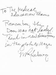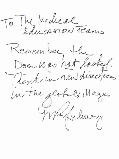 演讲结束后,Roy Schwarz教授和学生们亲切交流,华西医学生医学教育团队的代表廖虎同学向他介绍了该团队的活动情况,得到其鼓励和赞赏。Roy Schwarz教授欣然为医学教育团队题词,勉励大家牢记“通向医学堡垒的大门是敞开的,在世界村里寻找新方向”。
