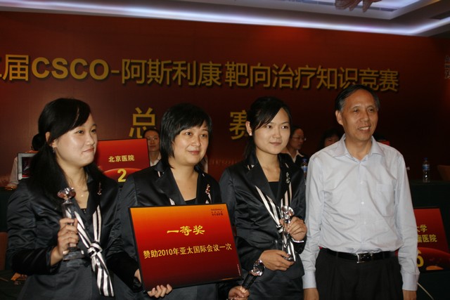 由中国抗癌协会临床肿瘤学协作委员会(CSCO)主办的第二届“CSCO靶向治疗全国知识竞赛”于10月14日在厦门举行,这次竞赛也是第十二届全国临床肿瘤学大会暨2009年CSCO年会重要组成部分,旨在通过竞赛方式向全国肿瘤同行推广靶向治疗的新进展。总决赛强手如林,卫生部北京医院、中山大学附属肿瘤医院、浙江大学医学院附属第一医院、山东省立医院、哈尔滨科大学附属肿瘤医院、福建省肿瘤医院等全国多家医院均派出代表队参赛。 我院肿瘤研究学生学会(Huaxi Student Society of Oncology Research, HASSOR)成员、2003级临床医学七年制学生宋欢和徐红玉和肿瘤防治中心黄媚娟医师组成的竞赛团队展现出丰富的临床专业知识和良好的竞技心态,一路过关斩将,最终勇夺全国总冠军,并凭借她们出色的个人魅力赢得了评委和观众的一致好评,获得 “最佳形象团队奖”,展现了华西医学生和青年医生的闪亮风采。会后组委会宣布,她们将被资助参加2010年亚太地区国际会议,在更高的平台上和国内外专家学者交流。
