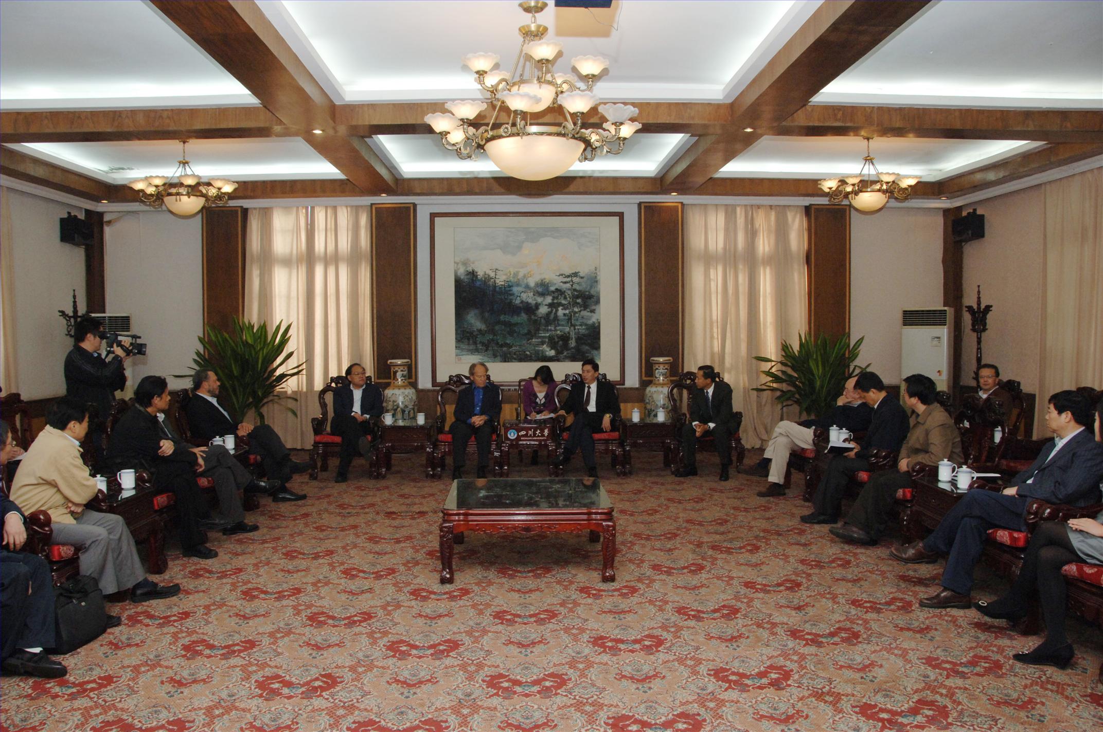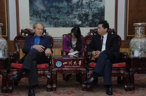 会见中,校长谢和平院士代表学校对托斯顿.韦素一行的来访表示欢迎,对托斯顿.韦素教授长期以来对川大医学发展的大力支持表示感谢。他说,近年来为了实现办高水平研究型综合大学的目标和任务,川大高度重视国际交流与合作,通过国际联合人才培养、科学研究与引进国外科学家等模式,与国外多家大学、研究所建立起良好的合作关系。谢和平校长表示,川大华西医院正在积极筹建的以托斯顿.韦素教授命名的国际眼科研究中心,将借助国家及地方提出的建设高水平研究平台以及大力引进海内外高端人才的良好契机,整合学校医学优势资源,强化团队和平台的建设,使之更具实体化;相信即将开建的高水平国际化的眼科研究中心,在托斯顿.韦素教授的牵头下,将组成跨学科的科研团队,汇聚全世界资深、著名的专家学者,形成全球范围的巨大影响力。