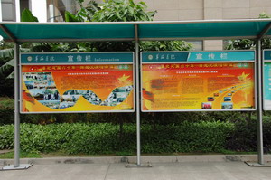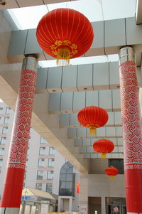 祝福祖国60年大庆的喜庆气氛洋溢在院内的各个区域。庆祝国庆的横幅挂起来了,鲜红的五星红旗迎风飘扬,大红的灯笼高高挂起,以“喜迎建国六十年,跨越发展谱新篇”为主题的学院、医院建国60年发展成就宣传栏引来职工和患者的驻足观看……