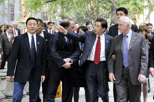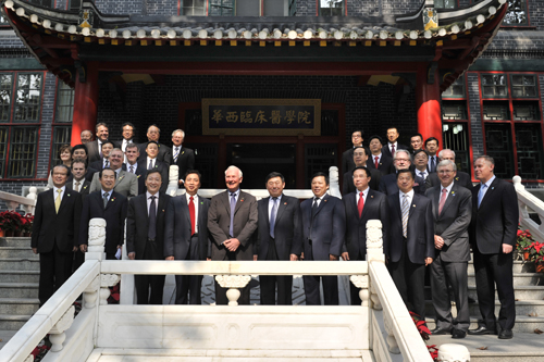 约翰斯顿总督一行首先抵达四川大学华西临床医学院第八教学楼。他走进这座由加拿大多伦多大学捐款、1928年建成的时称医牙科楼的古建筑,在四川大学华西医院全景鸟瞰图前,四川大学校长谢和平院士、四川大学华西医院院长李为民教授向约翰斯顿总督介绍了华西医院与加拿大的历史友谊和医院现在的发展情况。随后,四川大学校长谢和平院士在第八教学楼贵宾室会见了戴维•约翰斯顿总督一行,电子科技大学校长李言荣院士、重庆大学校长周绪红院士、西南大学校长张卫国教授、重庆医科大学校长雷寒教授、云南师范大学校长杨林教授,以及四川大学华西医院院长李为民教授等会见时在座。