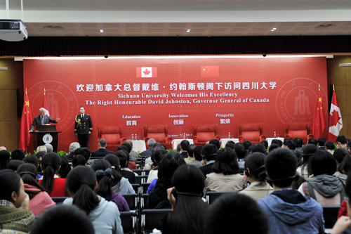 10月22日,加拿大总督戴维•约翰斯顿(David Johnston)阁下访问四川大学,出席四川大学“创新论坛”,并发表主题演讲,与中加学者和川大学生进行互动交流。