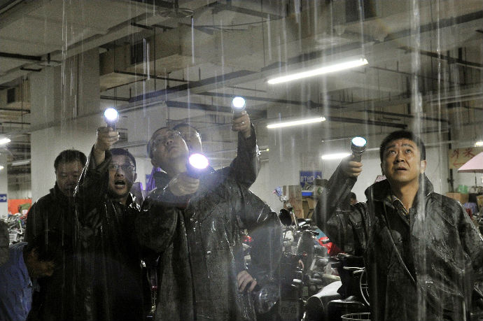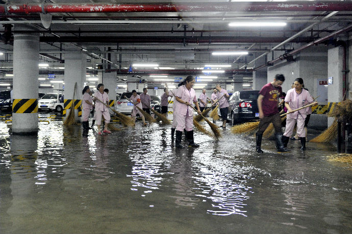 在第三住院楼地下室,由于雨量过大,管网排水系统出现大量漏水,雨水象瀑布一样倾泻到负一楼职工自行车库,附近库房安全受到威胁。采供维保部职工从中午一点持续到下午7点,不停的用大桶排水,保证库房安全;门诊地下室,大水直接从管网漏出,蔓延到负一楼、负二楼,保卫部、保洁公司的同志们用各种方式排水,并用沙袋筑好漏水区域与药库之间的防线,确保药库安全;在药库,出现少许滴水现象,药库同志们用各种方法确保药品安全。在地面积水较深和排水管道冒水的地方,保卫部、基建部、采供维保部的同志们携手用多台抽水机和长距离临时管道排水,保证路面安全。