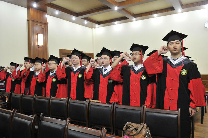 这是我院第二批毕业的临床医学专业八年制医学生,共有70名医学生被授予了临床医学专业博士学位的证书。在同学们即将踏上新的征程之前,作为院长、师长,同样也是学长的李为民教授首先祝贺大家经过八年的历练,获得了医学博士学位,同时也向这些年轻的博士们表达了他的寄望,他希望同学们在今后的日子中坚持自己的梦想,矢志不渝,怀有一颗“海纳百川、有容乃大”之心,树立正确的人生观、价值观、世界观,为成为一名好医生而奋斗,不愧于川大人、华西人的名号。这一席饱含深情的临别赠言和教诲,让在场的学生们深受感动。
