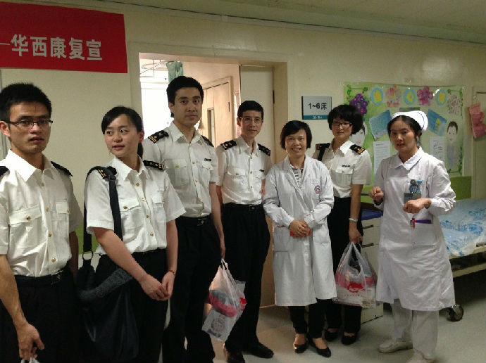 5月3日下午,成都海关一行8人到我院康复医学科看望在此次芦山地震中受伤的老年儿童,康复科副护士长王凤英热情地接待了海关工作人员,对他们的到来表示感谢。随后,她带领海关工作人员到病房内看望了伤员。海关工作人员为伤员们带来了营养品,还不断鼓励伤员们一定要配合医生的治疗,争取早日康复。