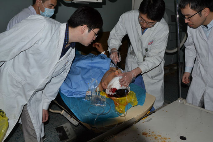 为了让地震伤员得到最及时、最准确、最有效的治疗,张乔会和同事们从救护车上把伤员抬到抢救床上,患者的意识、瞳孔、四肢肌力等的观察,患者病情的初步判断都是在送往急诊科抢救室短短20几米的路上完成的。意识不清的患者,张乔还会推着抢救床陪着患者去做急诊头部CT,并在CT扫描的同时完成读片、患者手术指征判定,并电话请示上级医生。对于需要急诊行开颅手术的患者,张乔会直接把患者从CT室送到急诊手术室,在路上联系好手术室、麻醉科,保障患者能在最短的时间内接受开颅手术。从急诊科的门口,到预检分诊区,到抢救室、影像科、再到手术室都能见到他忙碌的身影。从20日8:40分,接诊第一名重型颅脑外伤的地震伤员开始,张乔和同事们就不停的忙碌着。20日到21日全天,大家都是在救治伤员的紧张工作中渡过的,累了就随处坐下打个盹儿,饿了就扒两口盒饭。