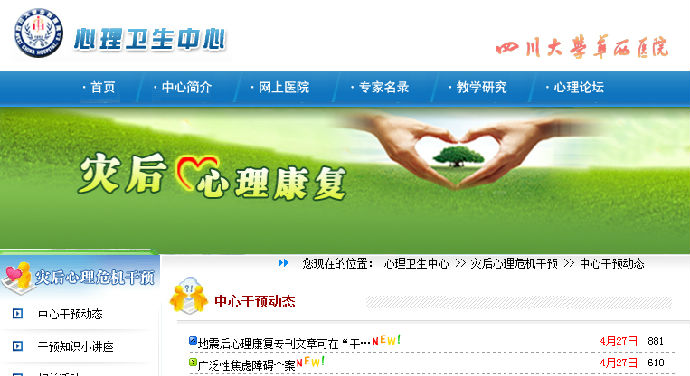 在资料宣传方面,4月28日已将地震灾后心理康复相关资料信息如“重视心理保健”、“给心灵打开一扇天窗”等上传至四川大学华西医院心理卫生中心网站http://www.cdxinli.com,在首页上可直接点击“灾后心理危机干预”版块进入并获取灾后心理康复相关信息。