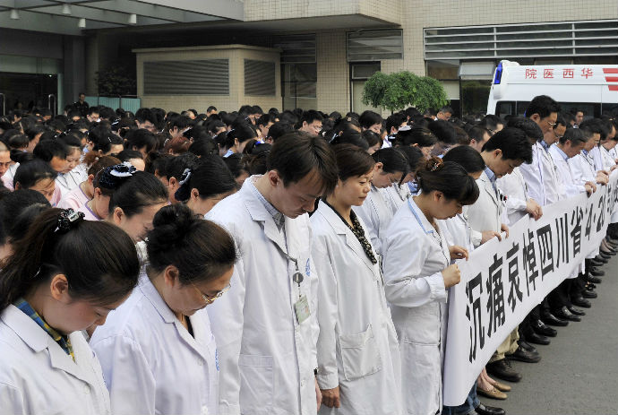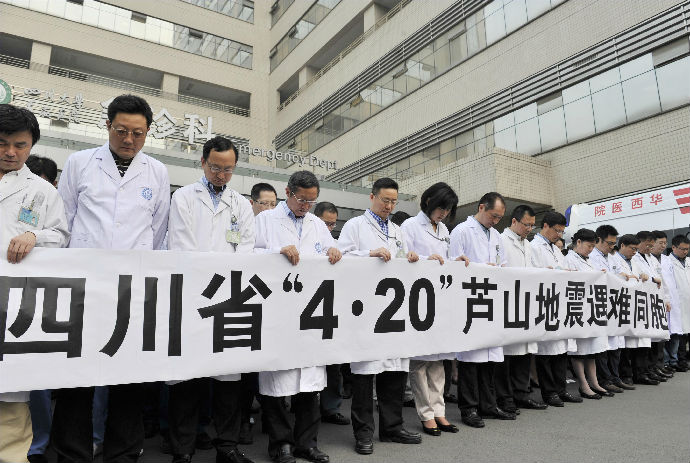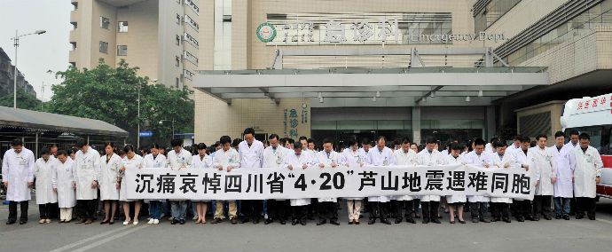 4月27日上午8:02,我院李为民院长、敬静书记等院领导及临床、医技、职能部门部分人员在急诊科门口,默默站立,那张写着“沉痛哀悼四川省‘4.20”芦山地震遇难同胞”的横幅紧握在医护人员手中,白纸黑字,诉说着对逝去同胞的哀思与怀念。一旁,两台救护车同时鸣笛。同时,我院其余8千余名职工,3千余名在读研究生、本科生在自己的岗位上默哀3分钟,表达对雅安芦山地震遇难同胞的哀悼之情。