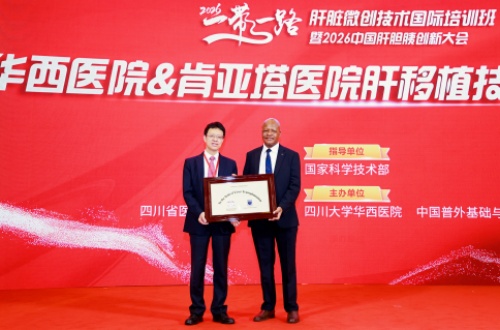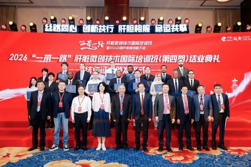 4月18日,由国家科学技术部指导,四川省医学科技创新研究会、《中国普外基础与临床杂志》及我院联合主办的2026“一带一路”肝脏微创技术国际培训班顺利结业。本次培训班以“丝路同心、创新共行、肝胆相照、命运共擎”为宗旨,吸引了来自意大利、肯尼亚、泰国等11个“一带一路”沿线国家的20名肝胆胰外科专家参训。会上,我院与肯雅塔医院肝移植技术援建项目、中埃远程手术中心合作共建项目也同步启动。