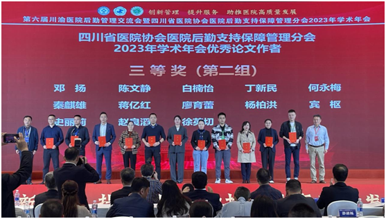 会上,我科室被评为“2023年度四川省医院后勤管理先进集体”,同时由陈文静科长撰写的《以<健康中国 2030 规划纲要>为指导的营养健康食堂建设实践与体会》也被评为优秀论文。