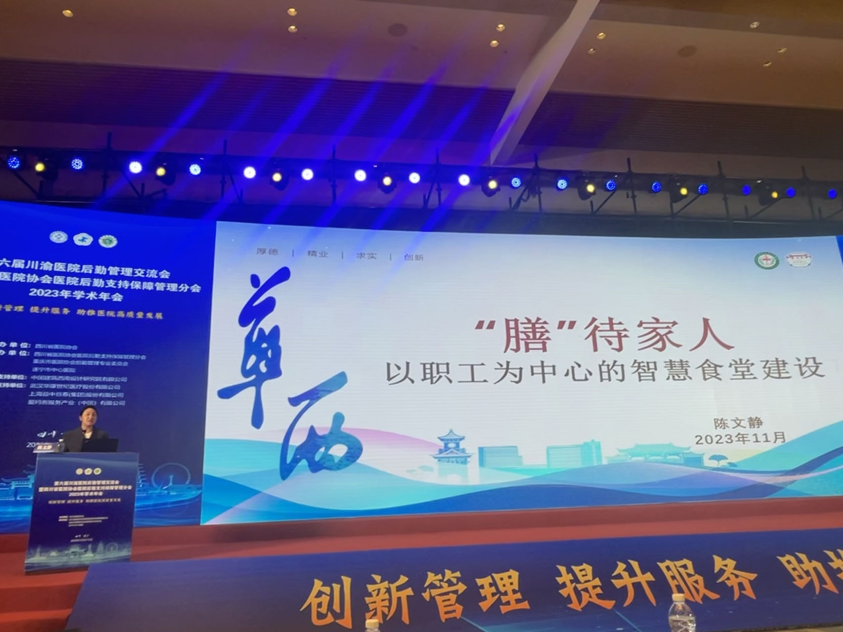 陈文静科长在会上向来自全国各地的27家医院代表做了名为《“膳”待家人,以职工为中心的智慧食堂建设》的心得分享。